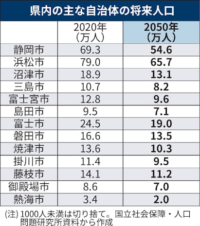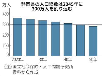 厚生労働省の国立社会保障・人口問題研究所が22日発表した地域別の将来推計人口によると、2050年の静岡県の総人口は282万8000人となる。20年(363万3000人)比で22%減で、30年間で県内最多の浜松市に匹敵する規模の人口が減る見通しだ。人口減少や高齢化を見据えたインフラ整備や都市政策が一層重要になる。