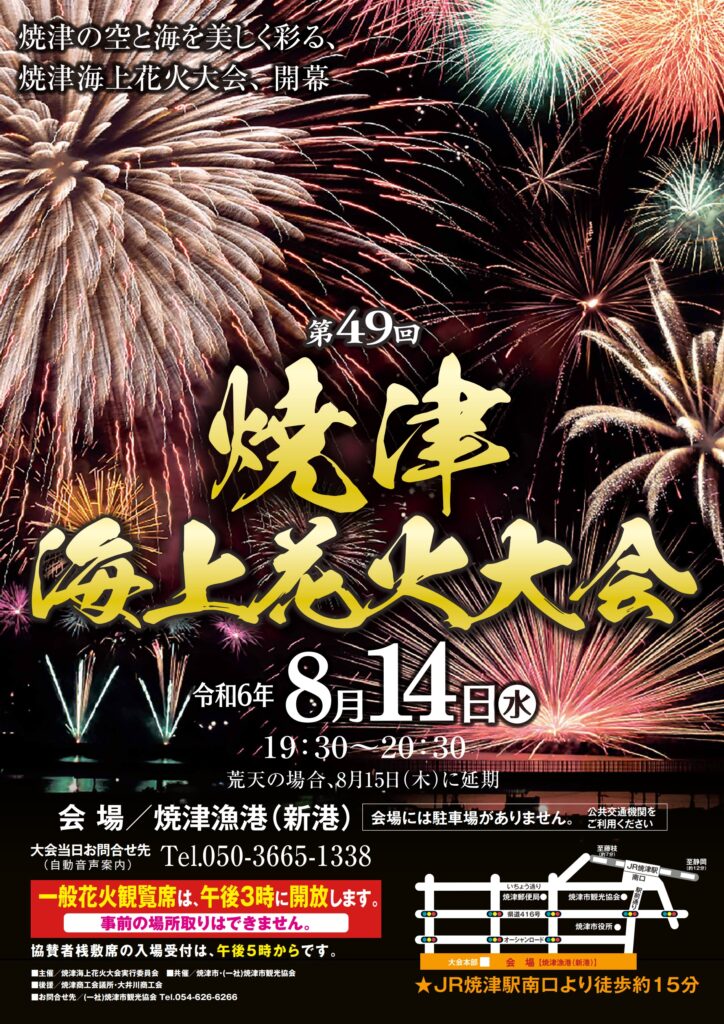 8月14日(水)に開催を予定していた「第49回焼津海上花火大会」は、気象庁から「南海トラフ地震臨時情報(巨大地震注意)」が発表されたことから、来場者の安全を考慮し開催を延期することを決定いたしました。